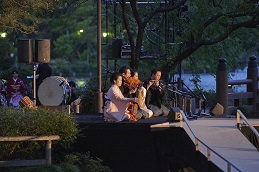 さて、40,000uの洗足池に陽が落ちる6時半、いよいよ『春宵の響』の始まりだ。西岸に架かる『池月橋』から幻想的な笛と鼓の音が水面に響き渡る。その幽玄の音をお届け出来ないのが残念だが、せめて写真で雰囲気だけでも味わっていただきたい。