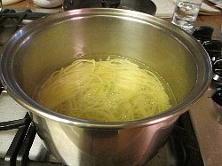 長いスパゲティーを茹でる長方形の鍋があまり日本人の家には無い。私などは面倒なのでいつも乾燥したスパゲティーを半分に折って鍋で茹でていたがこの方法だと長いまま茹でることが出来て便利だ。そういえばスパゲティーを食べる時に昔は右手でフォークをくるくる回し左手に持ったスプーンの上でまとまったスパゲティーを口に運んで食べていたのでそんなにスパゲティーの汁が飛び散らなかったと思うが最近はレストランでもフォークしか出てこない店も多い。特にトマト系やイカスミ系のスパゲティーはどんなに気を付けていても汁が跳ねてしまって衣服がシミになっている事もあった。私の食べ方が下手なのかと思って良く見ていたら結構スパゲティーを注文していた友人の服にもスパゲティーのシミを発見した時があった。 それから外で食事をする時にはなるべくスパゲティーは注文しないようにしている。スパゲティーだけでなく、ラーメンや冷やし中華はもちろん、おしゃれな洋服で食べるわけにはいかないしデートの時など特に麺類はご法度だ。
