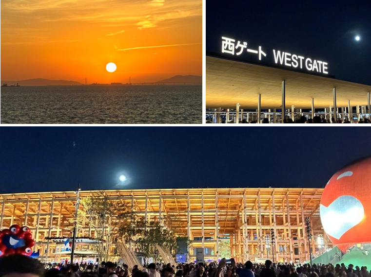 6日の日は天皇陛下がご訪問されていたようですが、それに関係なく会場はたいへんな人出で、歩くのも一苦労でした。東ゲートから入場したのは16時頃。パビリオンの予約はなかったので、まずは大屋根リングに上がると、ちょうど空飛ぶ車のデモ飛行を見ることができました。その後、会場の西の端まで歩いて、瀬戸内海に沈む夕陽を眺め、あたりが暗くなる頃には「中秋の名月」が西ゲート付近の空に美しく浮かんでいました。