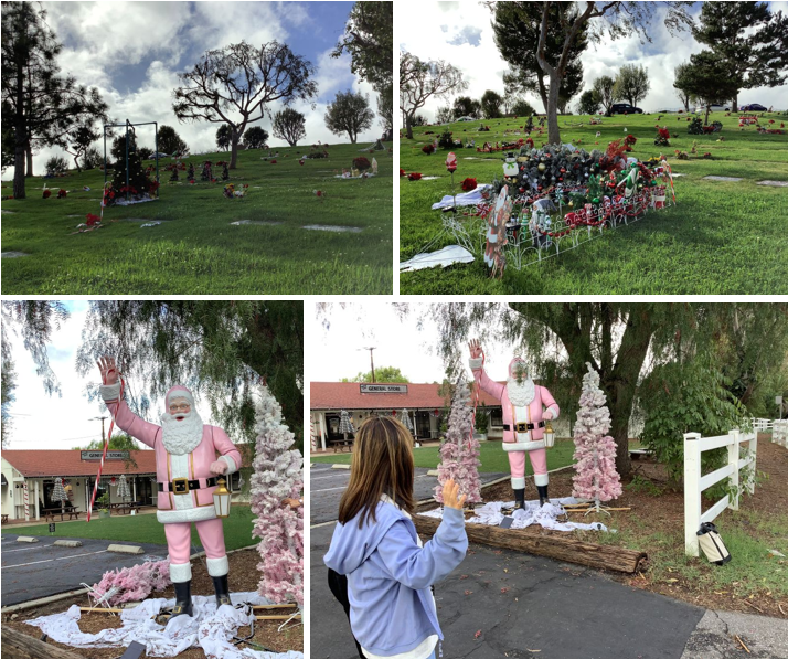 グリーンヒルズメモリアルパーク( 霊苑) の前を通るとたくさんクリスマスツリーやカラフルな花などで彩られたお墓が賑やかです。故人を偲んでそこでシャンペンやワインを飲んでいる人たちもいました。ここの霊苑には友人の旦那様が2人、私のクライアントさんだった方が4人永眠されています。日本人や日系の方々のお墓も多いようです。