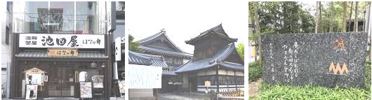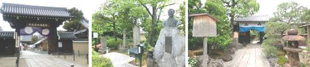 まずは「壬生寺」(みぶでら)(写真左)――鑑真(がんじん)上人の律宗(戒律の研究と実践を行う仏教)の寺。幕末には『新選組』の兵法調練所として使われたので、隊の名も「壬生浪士組」と命名された。境内の「壬生塚」(写真中)には、近藤勇の胸像・遺髪塔・ 芹沢鴨らの墓がある。「壬生寺」の近くに壬生村の名家だった「八木家」がある(写真右)。この「八木家」で『新選組』と言う名の隊が誕生した。門柱に“松平肥後守領新選組宿”の表札が掲げられていた。1865年(慶応元年)に西本願寺に移るまでの2年間、『新選組屯所』として使われた。